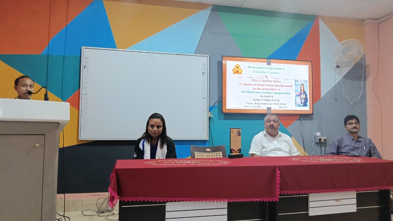 Jorhat college felicitated ex student udeshna saikia on her achivement ( bronze medal in international arms wrestling competition held in Kazakhstan in 2025) on 7th novemeer 2025